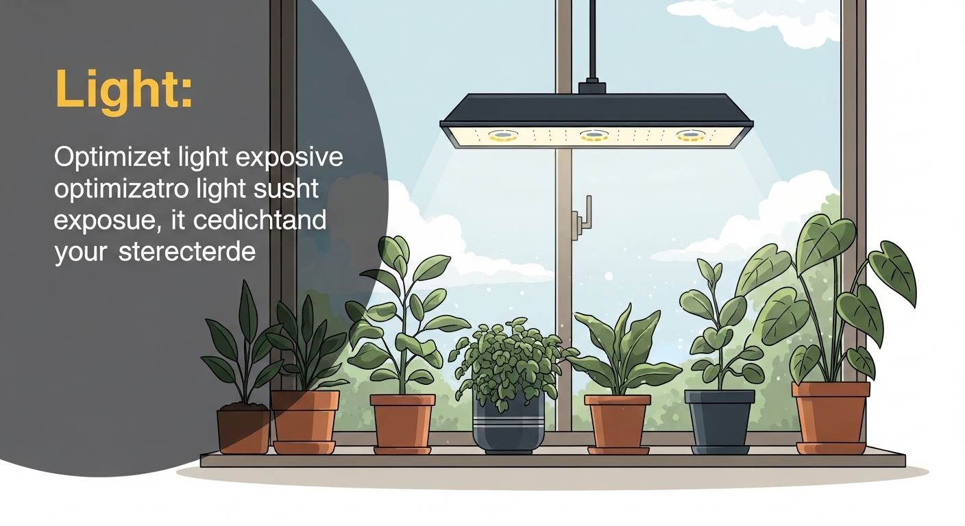 겨울철 일조량 부족은 식물 생장을 저해합니다. 남향 창가에서 1-2m 거리를 두고 배치하되, 직사광선보다는 밝은 간접광이 좋습니다. LED 식물등을 사용할 경우 하루 8-12시간 조명하며, 40-50cm 거리를 유지하세요. 창문에 반사 필름을 붙여 실내로 들어오는 빛의 양을 늘리는 것도 효과적입니다.