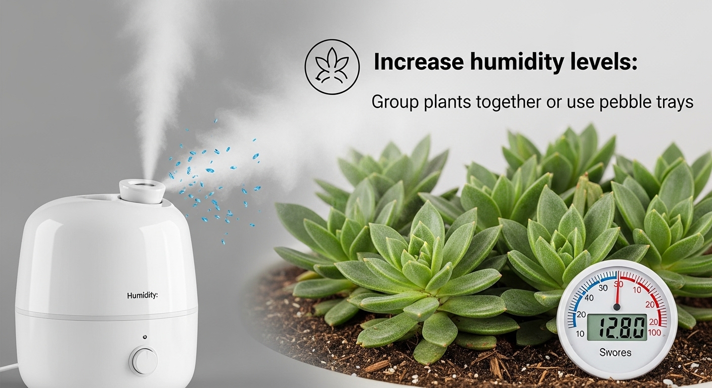 가습기 사용이 어려우면 물을 담은 그릇을 식물 주변에 두거나, 자갈을 담은 받침접시에 물을 부어 습도를 높이세요. 분무기로 하루 1-2회 잎에 물을 뿌려주는 것도 효과적입니다.